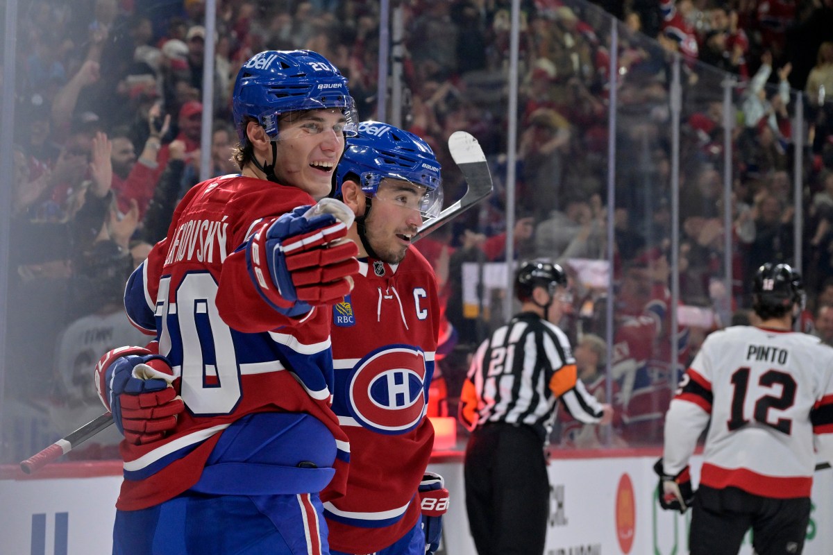 Nov 1, 2025; Montreal, Quebec, CAN; Montreal Canadiens forward Juraj Slafkovsky (20) celebrates with teammate forward Nick Suzuki (14) after scoring a goal against the Ottawa Senators during the first period at the Bell Centre. | Credit: Eric Bolte-Imagn Images