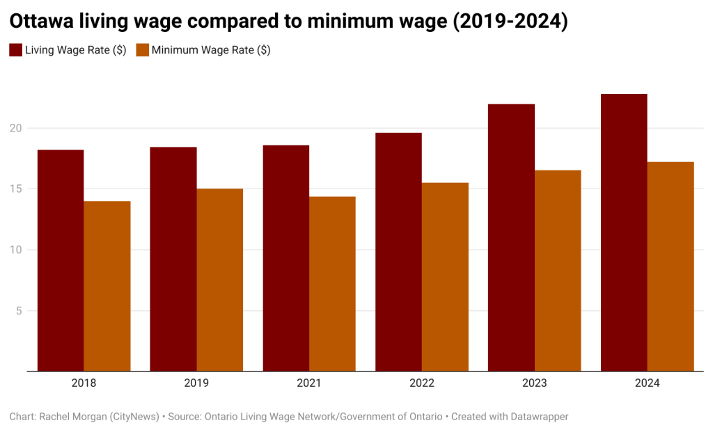 While there is no publicly available data on the number of Ottawa residents making minimum wage, analysis from the Canadian Centre for Policy Alternatives (CCPA) found that 15 per cent of those living in Ottawa are making below the living wage. That rate rises to 19 per cent when looking at racialized populations.