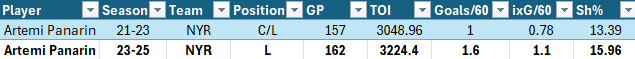 On the year, Panarin is averaging 0.8 individual expected goals per 60 minutes at all strengths. Here are his individual expected goal (ixG) and actual goal rates in two pairs of seasons from 2021-2023 and from 2023-2025, and the shooting percentages in each stretch: