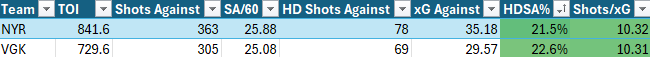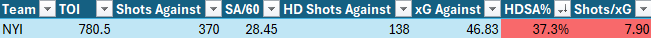 Yesterday on Twitter and BlueSky, I had short threads on how teams are faring defensively so far this season. What stood out immediately is how the performance of the New York Rangers. Namely, they have allowed the lowest percentage of high-danger shots as a ratio of all shots against at 21.5%, and opponents are requiring the third-most shots for every expected goal created at 10.32: