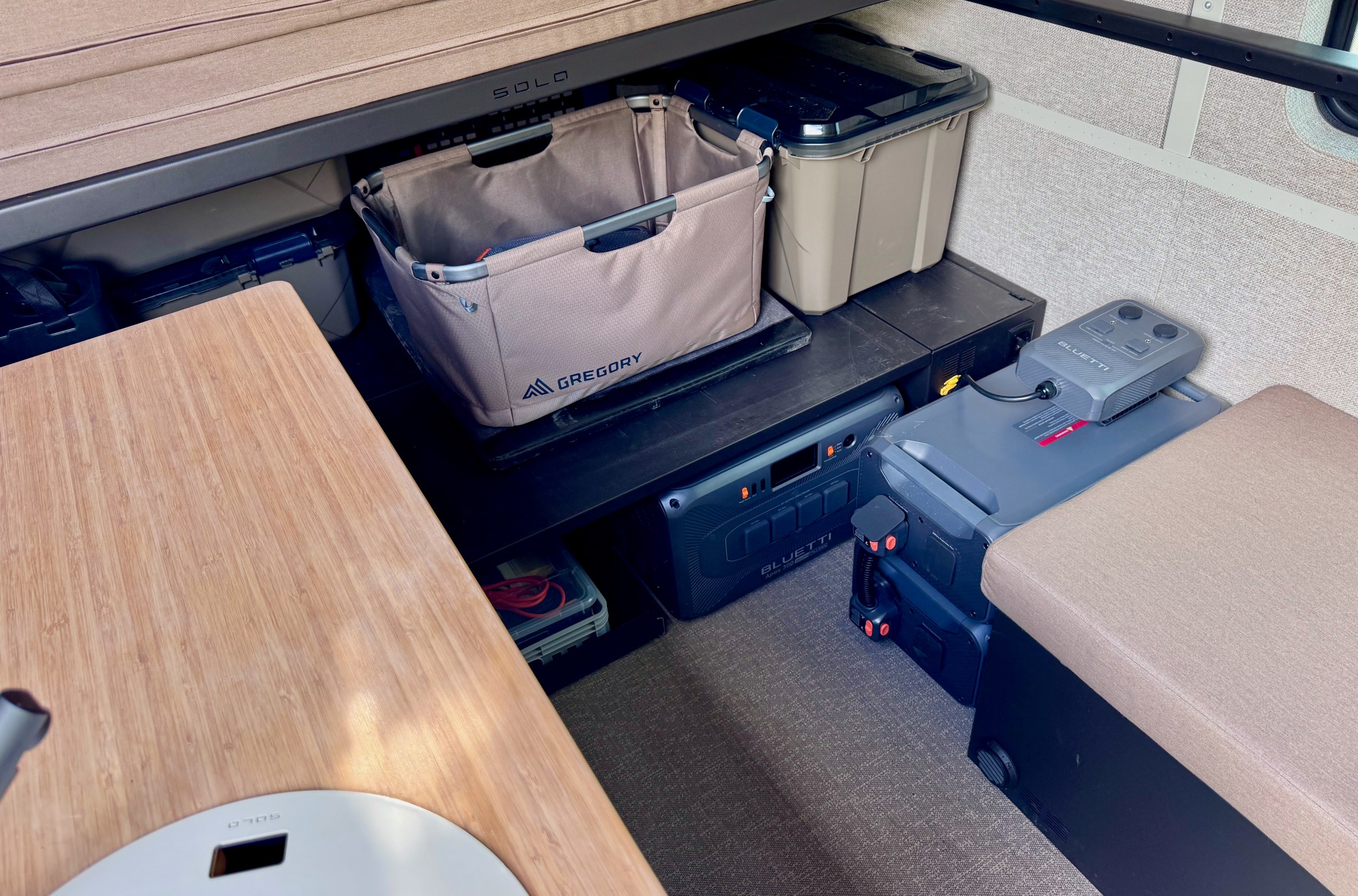 One SoGen feature that’s absolutely critical is a 12V DC output of at least 30A. Most high-end portable SoGens offer this type of high-amperage DC output, but not all. It’s required to efficiently power USB gadgets like laptops, phones, drones, action cameras, and a Starlink Mini; and portable appliances like a fridge and air compressor that plug into 12V “cigarette lighter” sockets. It also delivers power to 12V devices integrated into the interior like LED lighting, a water pump, and rooftop Maxxfan that meet in a fused distribution panel — in my hybrid installation, this is located inside a cabinet over a wheel well where all my electrical wiring terminates for easy access.