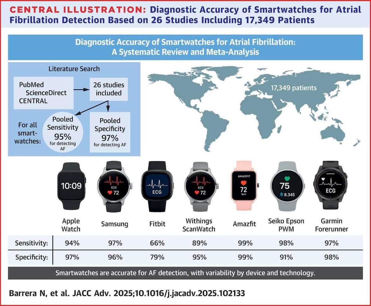 A new systematic review in JACC: Advances pulled together data from 26 studies covering 17,349 patients to find out just how good smartwatches really are at detecting atrial fibrillation. The answer is, surprisingly good. Across all models tested, the pooled accuracy was impressive, with a sensitivity of around 95 percent and a specificity of 97 percent. That means these devices correctly identified AFib in most people who had it, while also correctly ruling it out in those who didn’t.