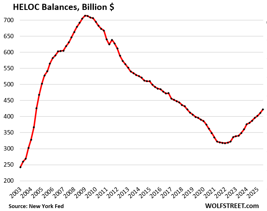 Despite the 33% surge off the 2021 bottom, HELOC balances are still relatively low. HELOCs are lines of credit, and many of them are unused, just sitting there as a standby source of funding. But the balances here are actual balances drawn on HELOCs: