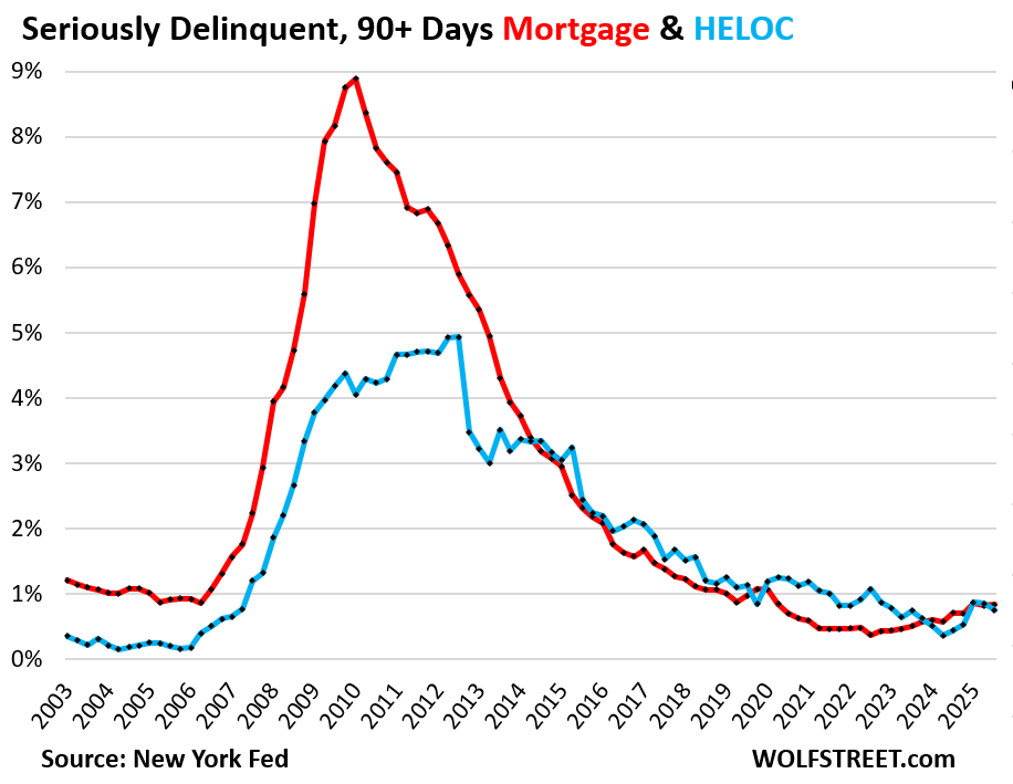 Serious delinquency rates – 90 days or more delinquent – were unchanged for mortgages at 0.8% (red in the chart below) and edged down for HELOCs to 0.8% (blue). These are very low delinquency rates.