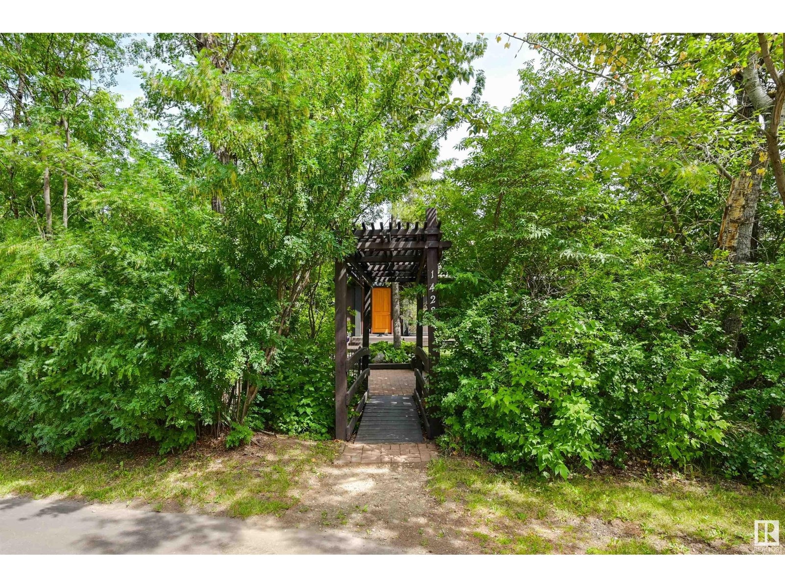 But as you approach the property, a covered wooden pathway carries you through the trees and toward the home, where a pond, mature trees and a striking orange door greet you.