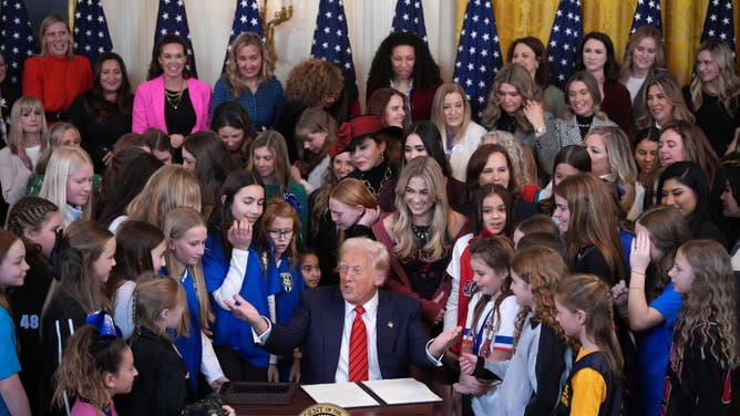 U.S. President Donald Trump joined by women athletes signs the “No Men in Women’s Sports” executive order in the East Room at the White House.