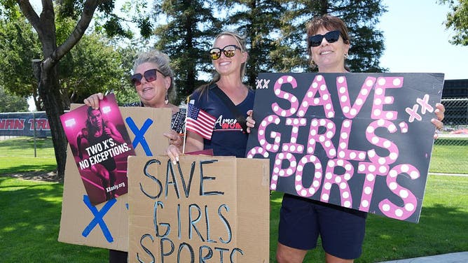 Protestors in California hold signs in support of protecting girls’ sports outside a high school track meet.