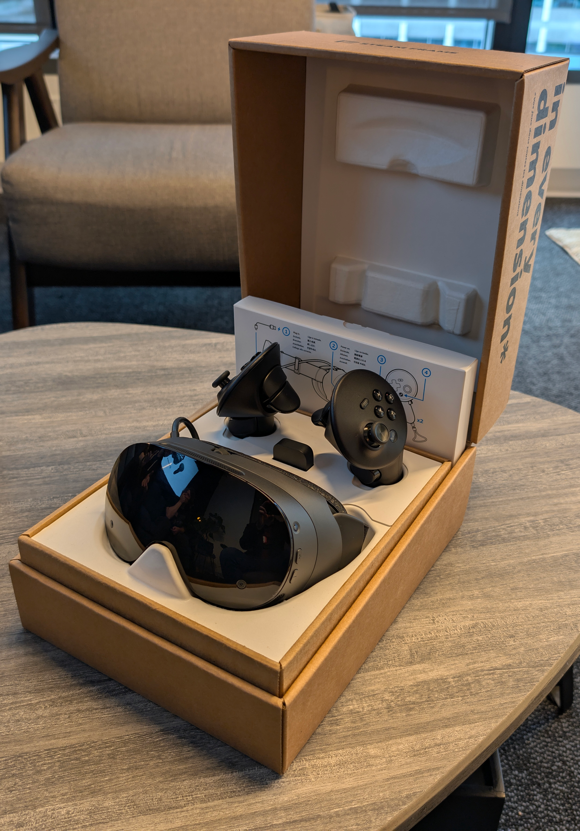 The Steam Frame box included the wireless adapter, front and center (photo by UploadVR at Valve HQ).