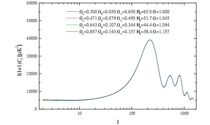 Four different cosmologies lead to the same fluctuation patterns in the CMB, showing how different combinations of an expansion rate and the fractional components of the Universe can lead to identical results. Even though the present expansion rate of the Universe is severely different between all of the models shown here, parameters like the age of the Universe or the cosmic distance between any two points only change very slightly as we vary the allowable models.