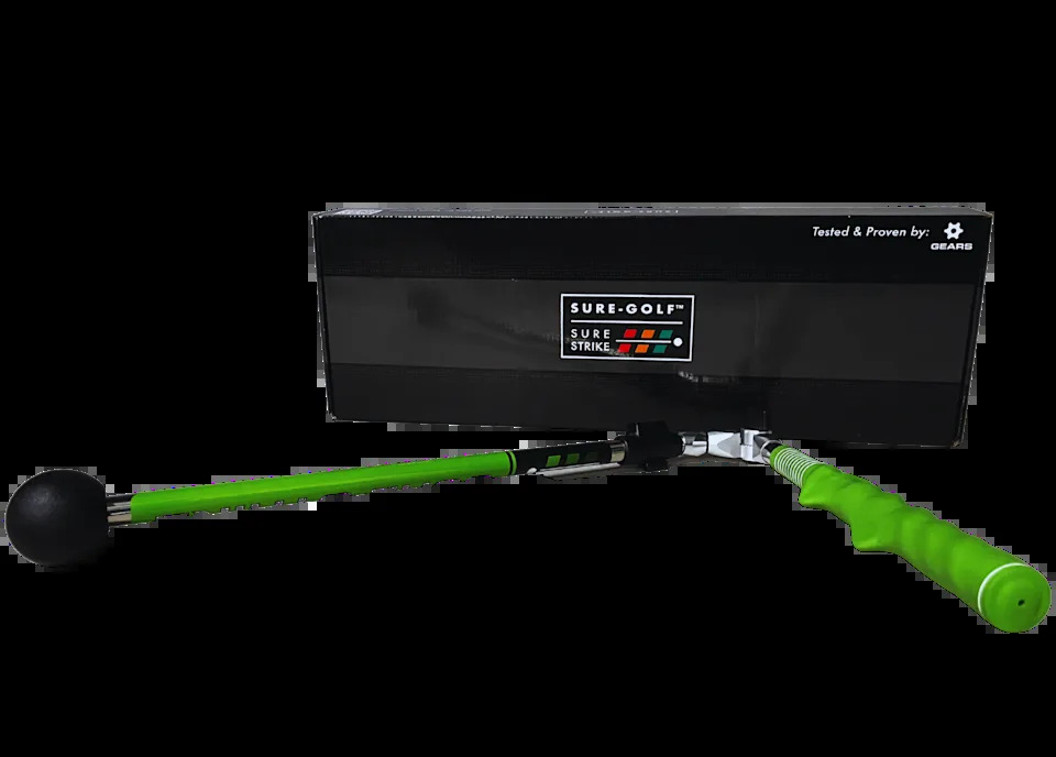 Sure-Strike The golf swing trainer designed to help you master your swing mechanics to swing like a Tour Pro! The Sure-Strike is not just another training aid; it’s a game-changer. This new golf swing trainer is meticulously crafted to instill perfect swing mechanics, creating a permanent shift in your performance. Say goodbye to inconsistent swings and hello to a new level of precision and power. Key Benefits of the Sure-Strike Training Aid Transform your timing for solid contact and an efficient swing. Improve swing path and attack angle for optimal ball-then-turf contact and true compression at impact. Enhance swing sequence, ensuring perfect coordination between body, arms, and club. Train a shallow swing plane for true lag and increased clubhead speed. Experience freedom and effortlessness in your swing, unlocking your natural athleticism. Suitable for golfers of all skill levels. Crafted with precision and durability in mind. Elevate your golfing experience and unleash your true potential. With the Sure-Strike, you’ll experience a transformation in your timing, resulting in solid contact with the ball and an overall more efficient swing. This training aid focuses on improving the path of your swing and attack angle, allowing you to find the ideal low point and achieve that coveted ball-then-turf contact. The result? True compression at impact and a newfound level of control over your shots. One of the key benefits of the Sure-Strike training aid is its ability to enhance the sequence of your swing, ensuring that your body, arms, and club work together in perfect harmony throughout the entire motion. By training in efficient transition, impact, and follow-through, you’ll experience a level of consistency and fluidity you’ve only dreamed of. The Sure-Strike empowers you to feel and train a shallow swing plane, leading to true lag and a powerful impact. This shallow plane not only promotes better contact with the ball but also generates greater clubhead speed, resulting in longer and more accurate shots. Feel the satisfaction of hitting crisp, penetrating shots that soar through the air with ease. By incorporating the Sure-Strike golf training aid into your training routine, little and often, you’ll witness a remarkable improvement in your range of movement. This swing trainer helps you achieve a feeling of freedom and effortlessness in your swing, unlocking your natural golf swing and allowing you to unleash your full potential on the course. Crafted with precision and built to last, the Sure-Strike is your trusted partner for transforming your golf game. It is easy to use and suitable for golfers of all skill levels, even for kids with the junior version. Practice with confidence and witness the evolution of your swing. Invest in the Sure-Strike today and elevate your golfing experience to new heights. Experience the joy of a consistent, efficient, and powerful swing that brings your game to a whole new level. Order now and unleash your true golfing potential! FAQs About the Sure-Strike Do Swing Trainers Actually Work? Yes! Golf swing trainers, like the Sure-Strike, teach you how to swing consistently while giving you instant feedback on your swing mechanics. Enough practice over time will build muscle memory that will translate to the course. How Do I Train My Golf Swing? In today’s age, there are an infinite number of ways to improve your golf swing. Golf training aids and repetition are some of the most popular and effective methods to improve your swing and your game overall.