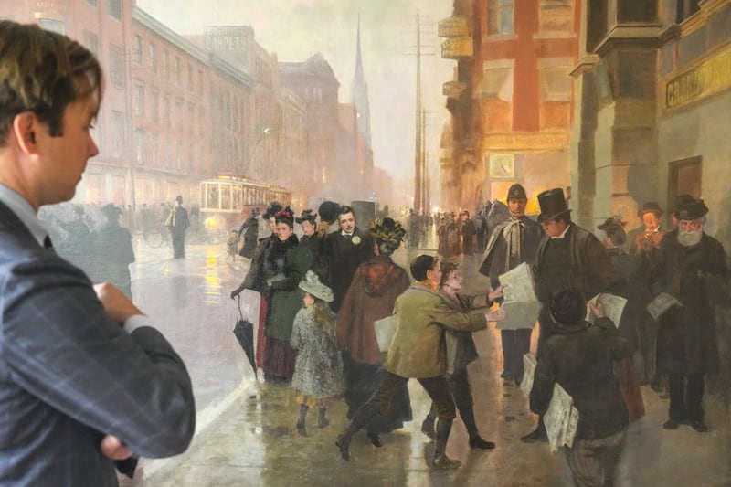 Another hotly-anticipated piece in the back-half of Wednesday’s auction was “Lights of a City Street” by Frederic Marlett Bell-Smith. The 1894 painting shows pedestrians strolling rainy Yonge and King streets in Toronto, while streetcars trundle past them and news peddlers sell copies of the Evening Telegram — perhaps an allusion to Bell-Smith’s many years drawing for the Canadian Illustrated News. It was valued at between $100,000 and $150,000.