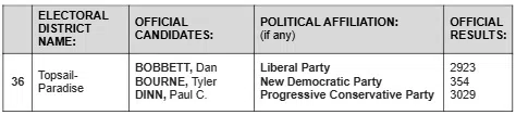 PC incumbent Paul Dinn defeated Liberal Dan Bobbett by 102 votes in the district.