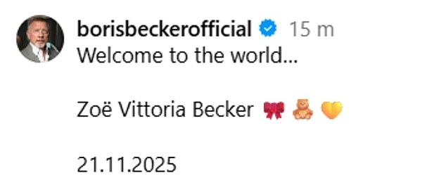 He announced Zoe’s arrival on Instagram on Saturday, writing: ‘Welcome to the world… Zoë Vittoria Becker 21.11.2025.’
