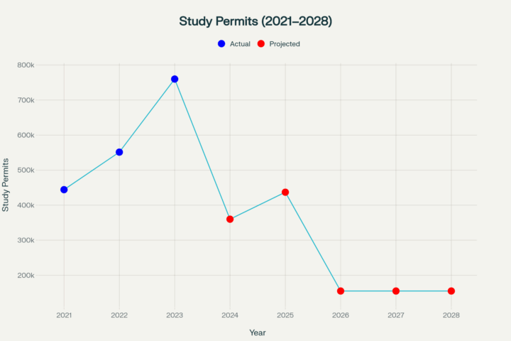 International Student Study Permit Intakes – Canada (2021–2028, Actual and Projected with Recent Policy Cuts). Graph created using IRCC data.