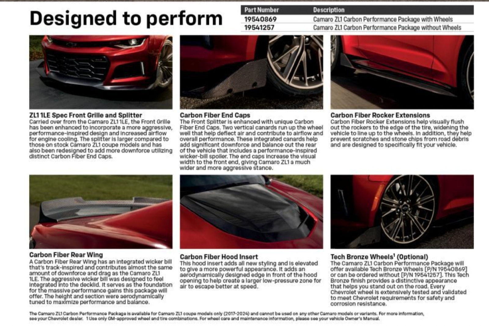 The production car team and motorsports team worked together to design and test the accessories package which allowed them to increase the downforce on the Camaro ZL1 road car by 361-percent at 155 mph. This also brings the total downforce of the ZL1 within a few percent of the ZL1 1LE. The package is already in the Chevrolet Performance parts catalog under part number 19541257 and according to GM Authority, the Chevy Camaro ZL1 Carbon Performance Package starts at $17,495 and goes up to $21,375 with the optional Tech Bronze wheels.
