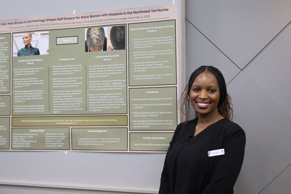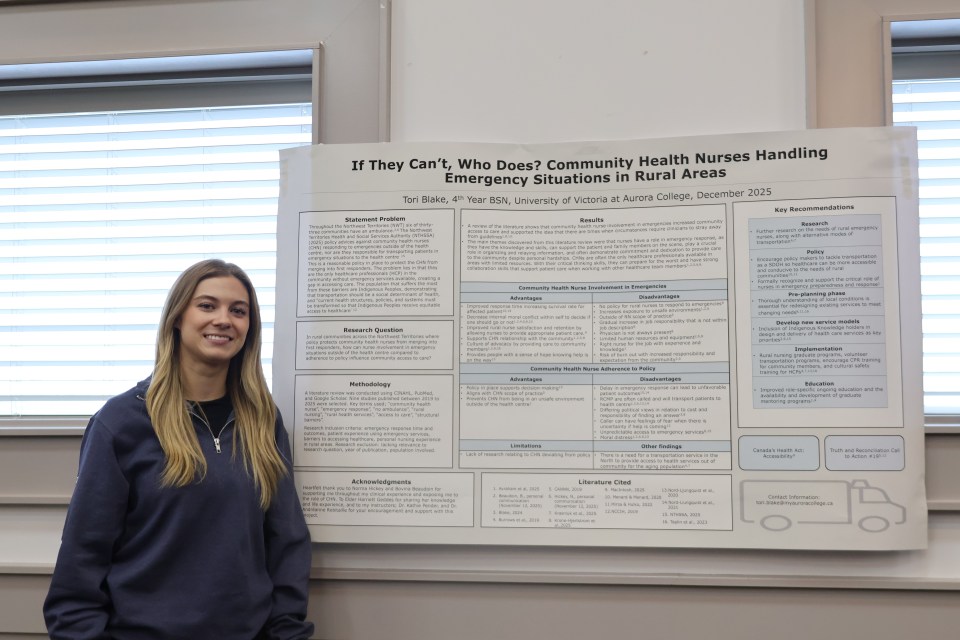 Among them was Tori Blake, originally from Hay River, who examined the role of community health nurses in rural areas and highlighted gaps in the system – including the lack of ambulance access in many communities.