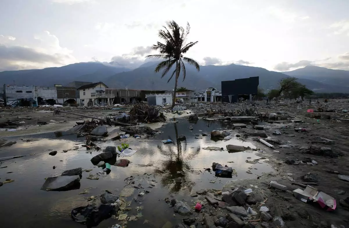FILE – A lone tree stands in the debris from structures that were wiped out after a massive earthquake and tsunami hit Palu, Central Sulawesi, Indonesia, Thursday, Oct. 4, 2018. (AP Photo/Aaron Favila, File)