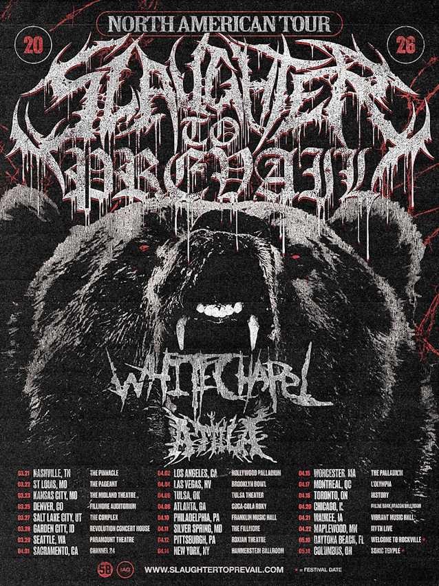 Russian metal powerhouse SLAUGHTER TO PREVAIL has announced a spring 2026 North American headlining tour. Featuring special guests WHITECHAPEL and ATTILA, the month-long run kicks off on March 21 in Nashville, with stops to follow in Denver, Seattle, Los Angeles, New York, Toronto, Chicago, and more. Tickets, including VIP packages, will be available Friday, December 12 at 10 a.m. local time.