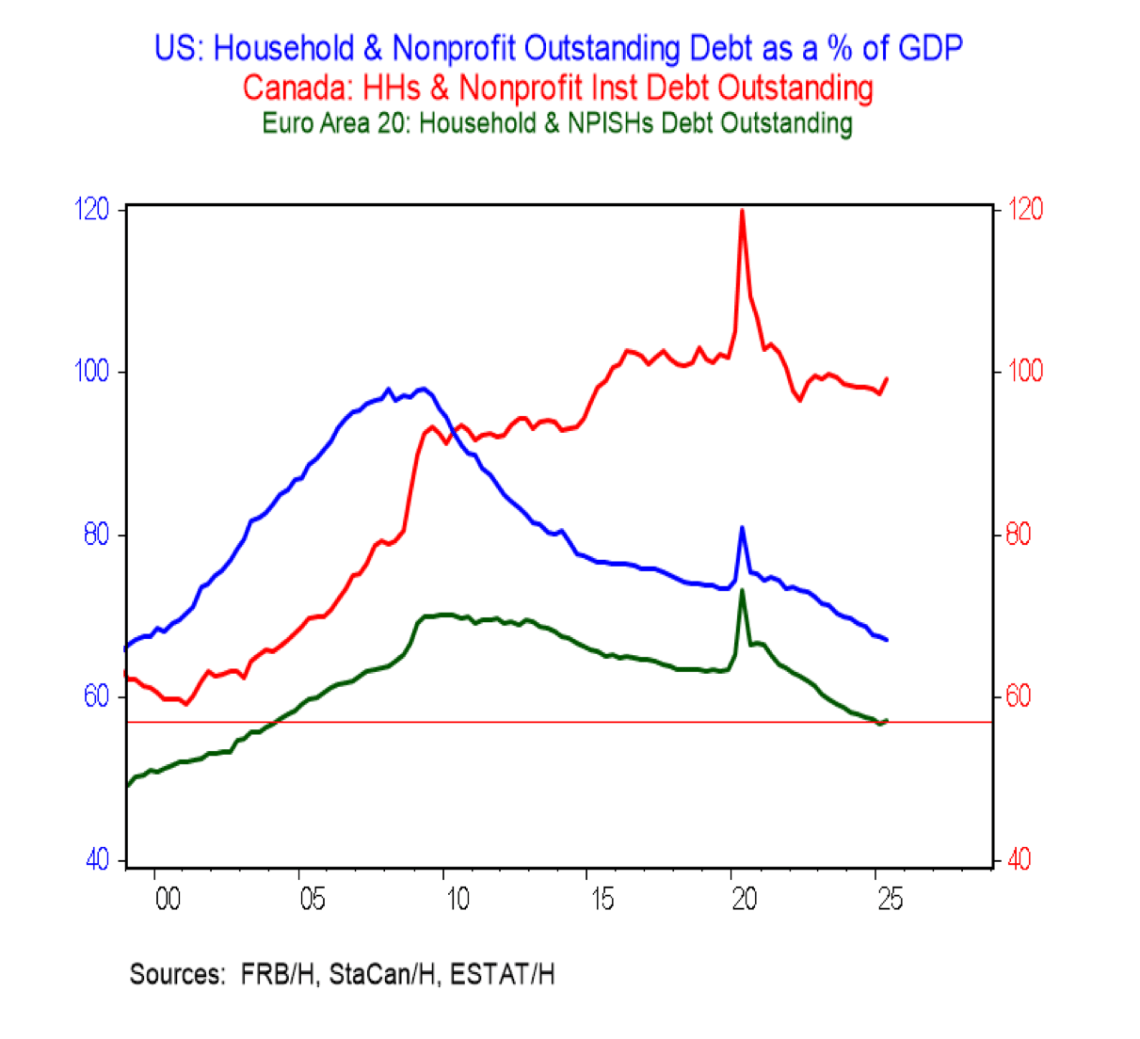 Since the Global Financial Crisis, households have generally been deleveraging. According to the IIF, global household debt dropped to 57% of GDP in Q3 2025. While advanced economies were higher at 67.4%, they’ve shed 1.4 points. “Aside from the wild distortions during 2020, the general pattern for household debt has been on the decline since the Great Recession in 2009,” explains BMO Chief Economist Douglas Porter.