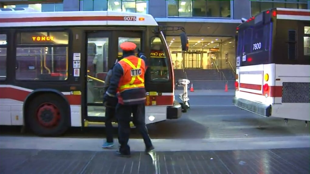 A TTC worker directs passengers on to shuttle buses near College Station.