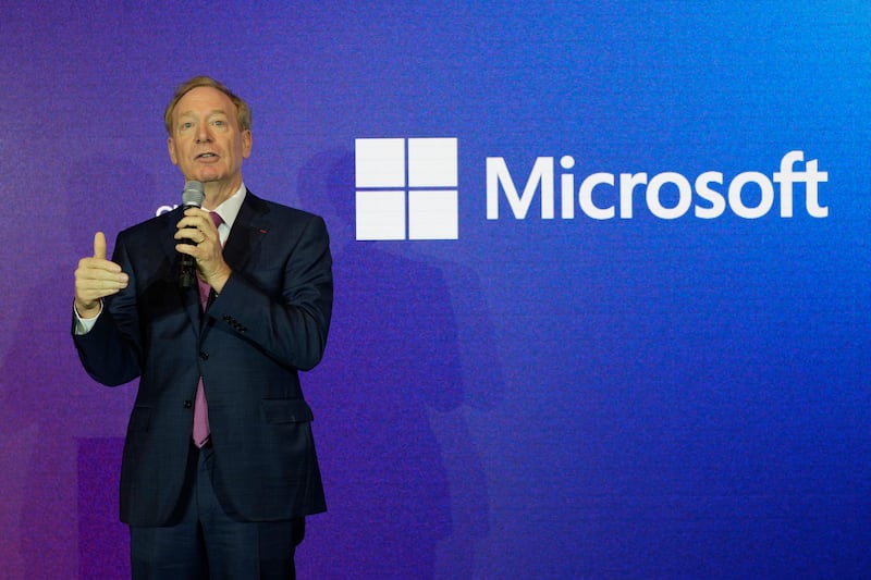 Microsoft Brad Smith Microsoft CEO Brad Smith delivers his speech at the French Microsoft headquarters in Issy-les-Moulineaux, outside Paris, Monday, May 13, 2024. (AP Photo/Thibault Camus, Pool)