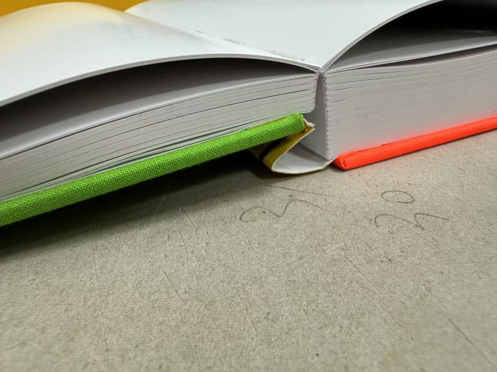 The printer mostly understood what I was trying to do with this backwards-opening cover. But there were lots of little things I had to solve. The first major problem with the book was it bulged along the spine. Originally, I thought the yellow spine (on the left, where the signatures meet) could be flush with the covers, but that caused the covers to bulge on that side, and it was very obvious (to me, at least). I found out by accident that this is one reason why hardcover books have those flexible hinge areas between the spine and cover boards—to allow some space for the signatures to expand into. So I decided to move all the cover boards 0.25” away from the spine, and that solved the bulging issue.