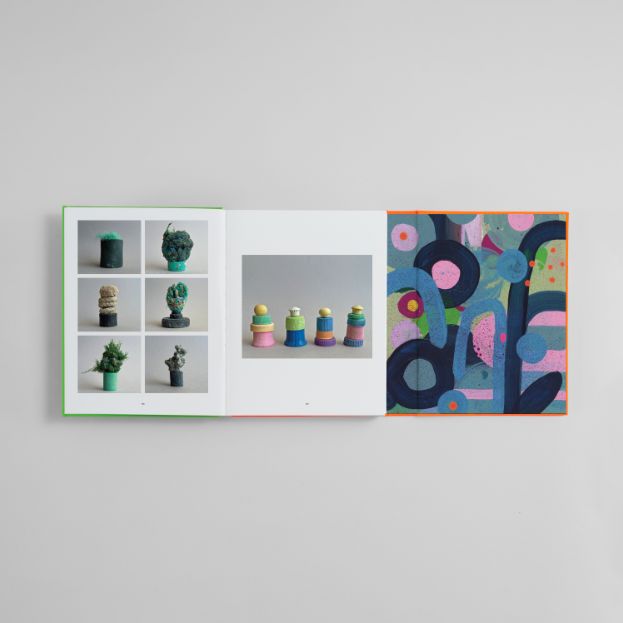 The solution we came up with was to make a book that was trying, but kinda failing, to categorize an artist’s work. There would be categories in the book, and most of the work in those categories would make sense there, but then, every once in a while, there’d be something that didn’t seem to fit. The flora category, for example, has paintings of flowers, large-scale floral murals, and a photo of multicolored ropes and wires “blooming” from a rusty tin can.