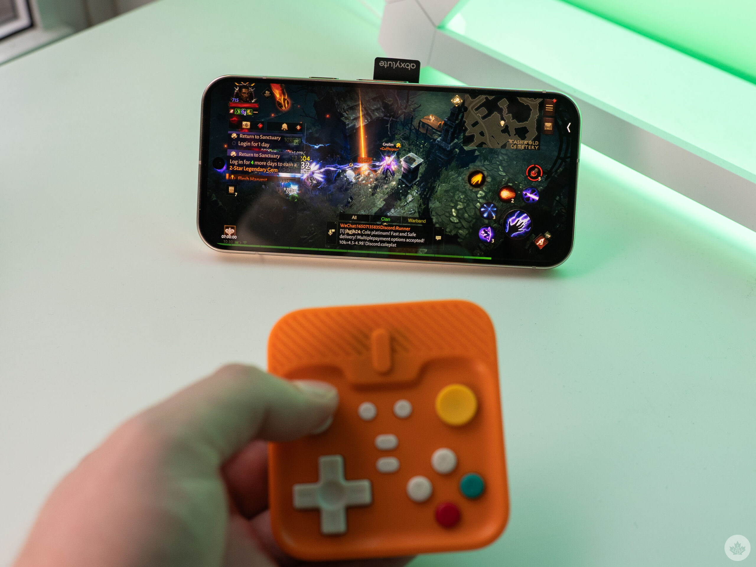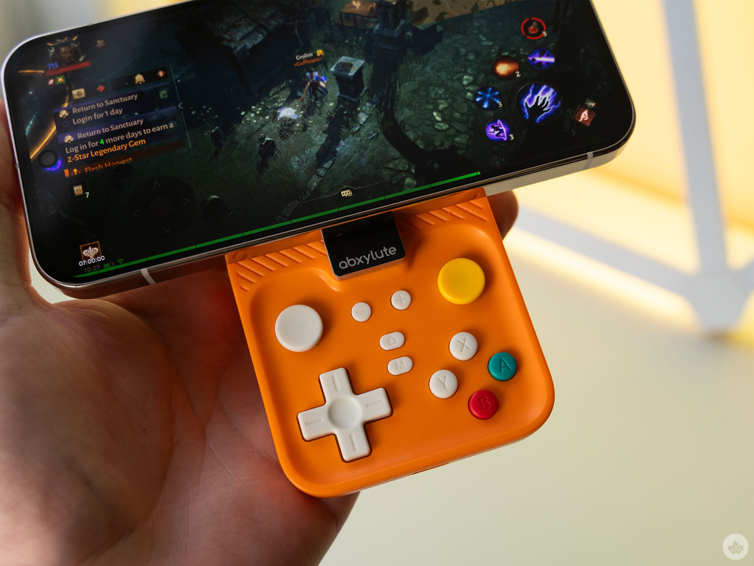 The other main part is the controller itself. It connects via Bluetooth to the phone. It sports classic Nintendo-style A, B, X, and Y buttons, a D-pad, shoulder buttons, and even two tiny joysticks. Some models, like the orange one I tried, also feature colourful buttons, and there are versions in the works with a semi-transparent plastic casing for that classic Game Boy look.