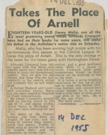 On December 17, 1955, Jimmy Melia scored a thumping left-footed volley on his Liverpool debut as the Reds beat Nottingham Forest 5-2 in the second division.