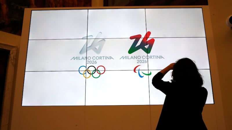 2026 winter Olympics The logo of 2026 Milan-Cortina Olympics and Paralympics, right, are unveiled to the journalists at a press conference in Rome, Tuesday, March 30, 2021. A futuristic white-on-white logo was unveiled as the emblem for the 2026 Milan-Cortina Olympics on Tuesday following an online vote. Nearly a million votes were cast, 871,566 to be exact, over the last two weeks from Italy and 168 other nations for the two finalists. The “Futura” logo received 75 percent of the votes, winning easily ahead of the more traditional “Dado” option. (AP Photo/Alessandra Tarantino)
