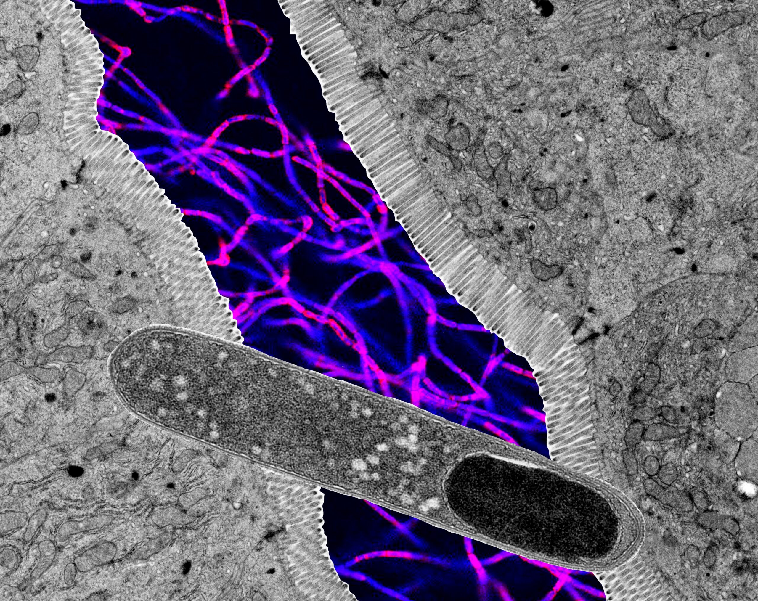 Collage of microscope images showing a rod-shaped Turicibacter (foreground), cross section of intestine, and fluorescent microscopy of more bacteria (background). Images not to scale. Image credit: Kendra Klag
