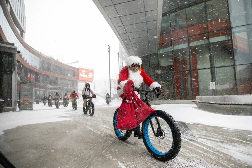 The weather was frightful — at times undeniably dangerous for cycling on city streets—but that didn’t stop more than a dozen riders from braving heavy snowfall and blustery winds for the 14th annual Cycle With Santa on Friday.