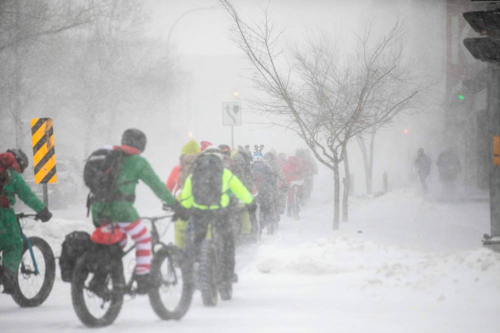 Equipped with thick tires built for winter riding, goggles to shield their eyes from blowing snow and dressed in an array of festive Christmas outfits, the cyclists pedalled through Winnipeg’s inner city with more than 1,000 pieces of clothing strapped to their backs, delivering warmth and cheer to those in need.