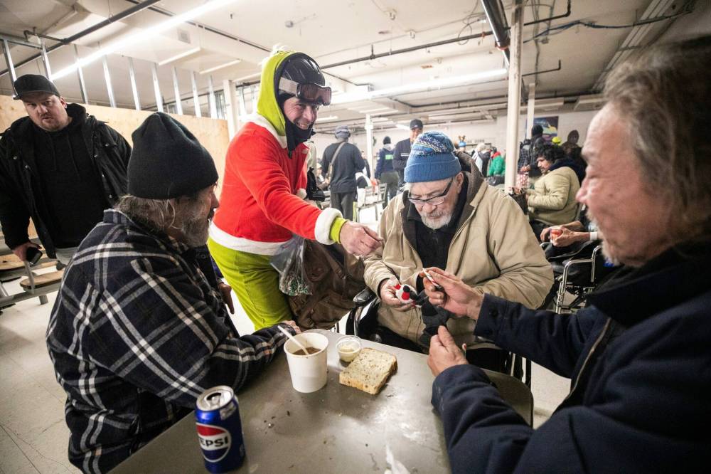 Those inside the building Friday received an added boost of holiday cheer, as the Downtown Community Safety Partnership dropped off dozens of blue backpacks filled with treats and essential winter clothing.