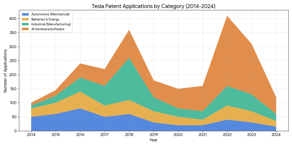 The data reveals a massive shift. The “car” part of Tesla is shrinking in the patent logs, first replaced by a surge in manufacturing innovations, then by patent applications linked to AI hardware and software.
