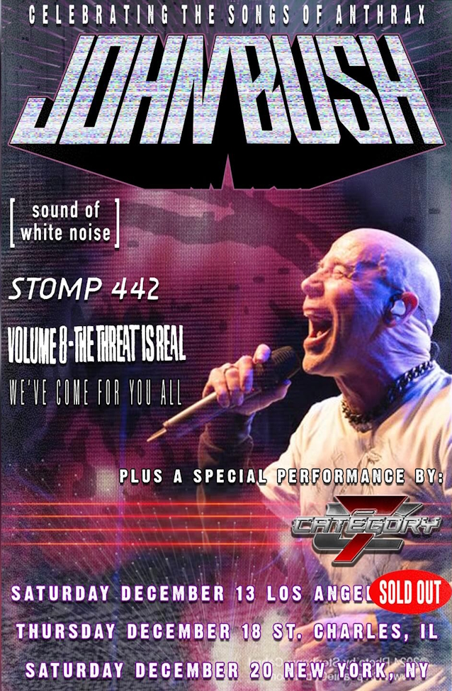 On Thursday, December 18, legendary vocalist John Bush played the second of three live concerts showcasing the music he helped create during his decade-long tenure singing with ANTHRAX. At the Arcada Theatre in St. Charles, Illinois, Bush performed songs spanning all four albums he recorded with the band: “Sound Of White Noise”, “Stomp 442”, “Volume 8: The Threat Is Real” and “We’ve Come For You All”. Joining Bush on stage were his CATEGORY 7 bandmates Phil Demmel (guitar),Mike Orlando (guitar) and Jason Bittner (drums),along with his longtime ARMORED SAINT partner and best friend Joey Vera on bass (CATEGORY 7 bassist Jack Gibson had a schedule conflict and was unable to make the gig). CATEGORY 7 also opened the show before returning as John’s backing band for the ANTHRAX material.