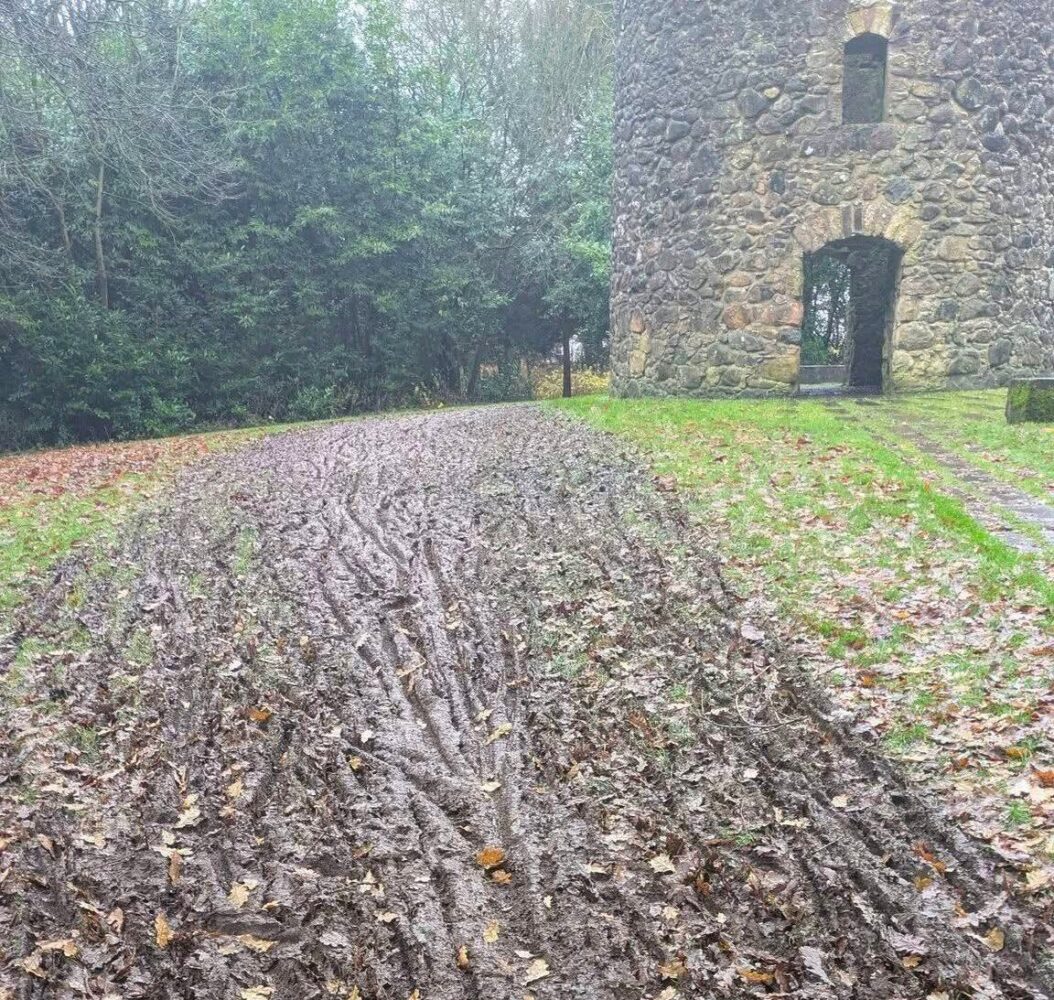 “The main concern relates to the single green area in the centre of the wood at the tower,” he said. “There was no need for this space to be cut up, particularly given the weather forecast at the time, which clearly indicated extremely wet conditions. This green area is enjoyed throughout the year by many as a play and picnic space.