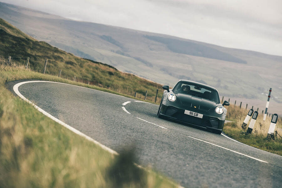 It’s a mark of the breadth of Porsche’s ambition that its price lists also include the 911 GT3, a hand-wound chronograph to the Taycan’s pulse-reading, internet-of-things smartwatch. Now in updated 992.2 guise, our low-key(ish) wingless Touring example, with its snappy six-speed manual gearbox, enthralls from the moment the 4.0-litre flat six fires into life with its trademark hollow bark.