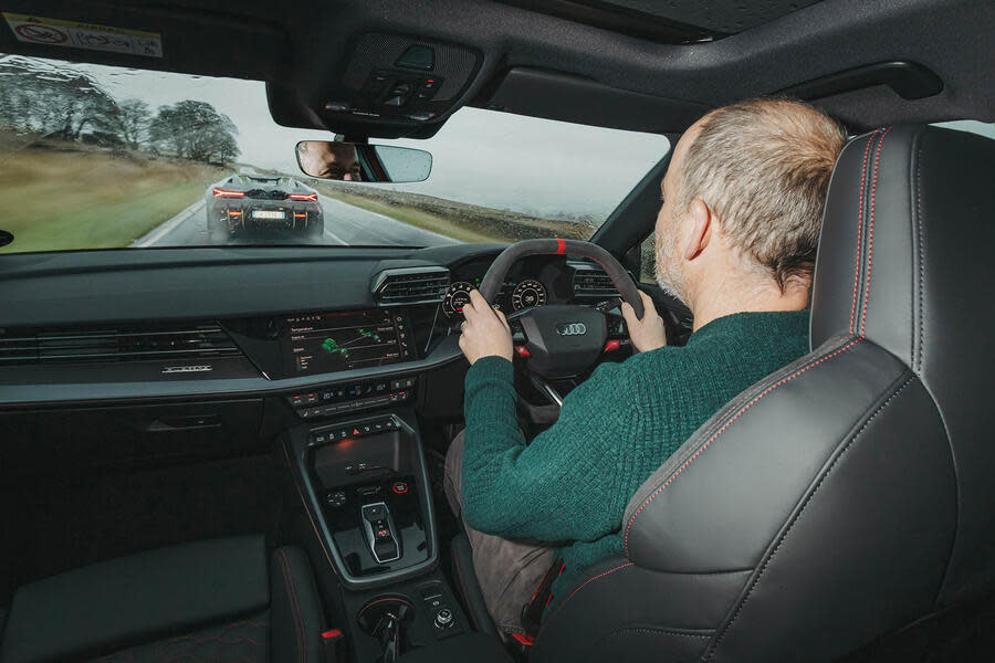 Saunders in particular is irked by the inertness of the steady-state handling and growing tired of the need to stab the car’s throttle Senna-style (well, sort of) to “tease some life into it”. The obvious theory is that the way the RS3 fleetingly shifts its balance rearwards under power is convincing on the road because limit-handling larks in public are just fleeting moments.