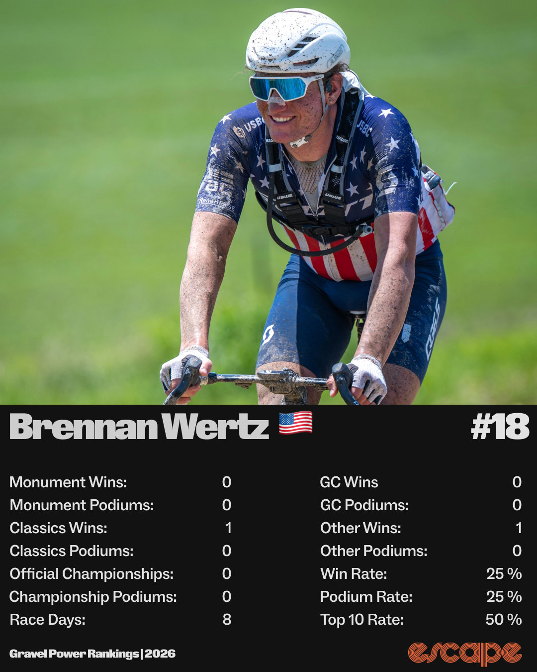 third at The Rift for a Gravel Monument podiumfourth at The Traka 200 (Monument) as well as at The Hills, Sea Otter Gravel, and Ranxo (all Classics) fifth at BWR California (another Monument)second at Santa Vall in GC and on stage 2second in GC at Sahara Gravel, plus three stage podiumsfour podiums in UCI GWS races (and three more top fives) 15th at Unbound