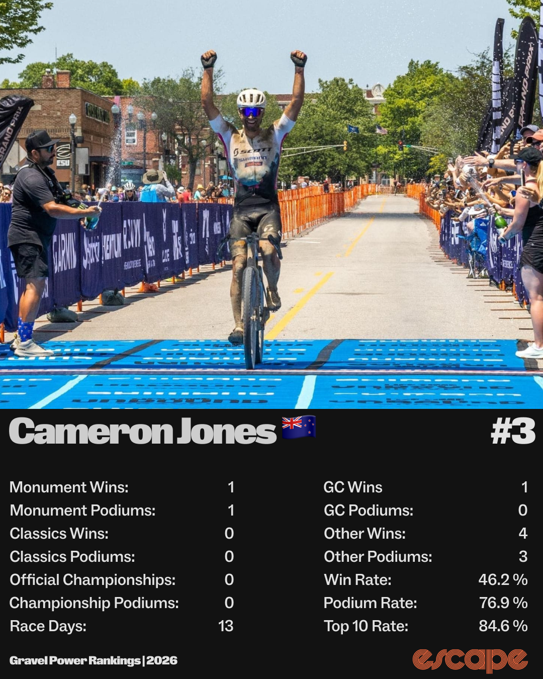 Drechou fortified his position in these rankings at the European Continental Gravel Championships with a strong third place. He sealed the deal at Gravel Burn, where he finished third on GC and on two stage podiums. These strong results towards the end of the season give him some extra points in the momentum category. What stops him from placing higher up? At Gravel Monuments and Classics, he got decent but no superb results. His 15th at Lauf Gravel Worlds, 19th at Sea Otter, and 25th at The Traka 200 all lower his win, podium, and top 10 rates.