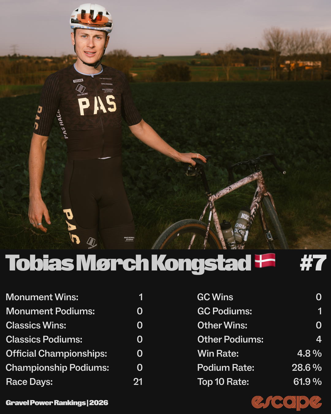 I changed my mind several times when it came to this spot. Kongstad has a Monument win to his name thanks to his long-distance solo to victory at The Traka 360. And he had other strong results, including 10th at Unbound, fourth at The Rift, three podiums at smaller Gravel Earth Series races (Megre, Gravel Weekend Latvia, Core4), and a second place at Dustman, the Thailand stop of the UCI GWS.