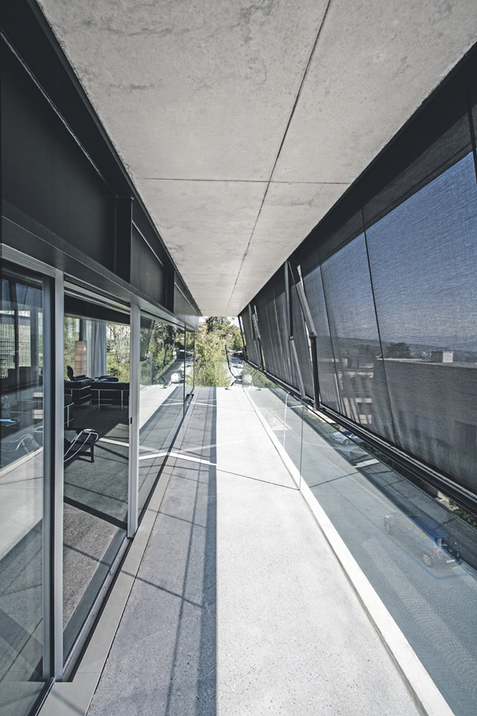 The steel frame, thermally separated from the glass façade, penetrates the concrete slabs and releases the interiors from conventional constraints. Inside, frameless sliding glass walls dissolve the boundary between apartment and landscape, opening views across the city, lake and surrounding tree canopy. Balconies and loggias extend the living spaces outward, while deep floor plates and overhangs temper light and heat with quiet control.