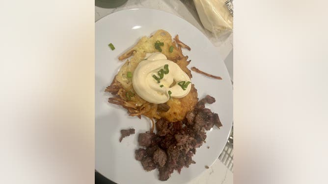 Brisket, latkes, and Honduran crema instead of sour cream. Cooked in chili infused beef tallow. Bigger than most cook them, but still awesome. No applesauce in this house.