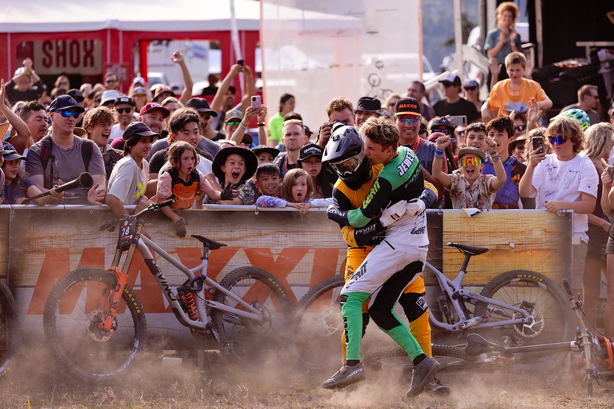Dane Jewett, in green, congratulates his brother Jake Jewett on winning the pro men’s race on 1199 in Whistler For 2026, it’ll be a World Cup track. Photo: Clint Trahan
