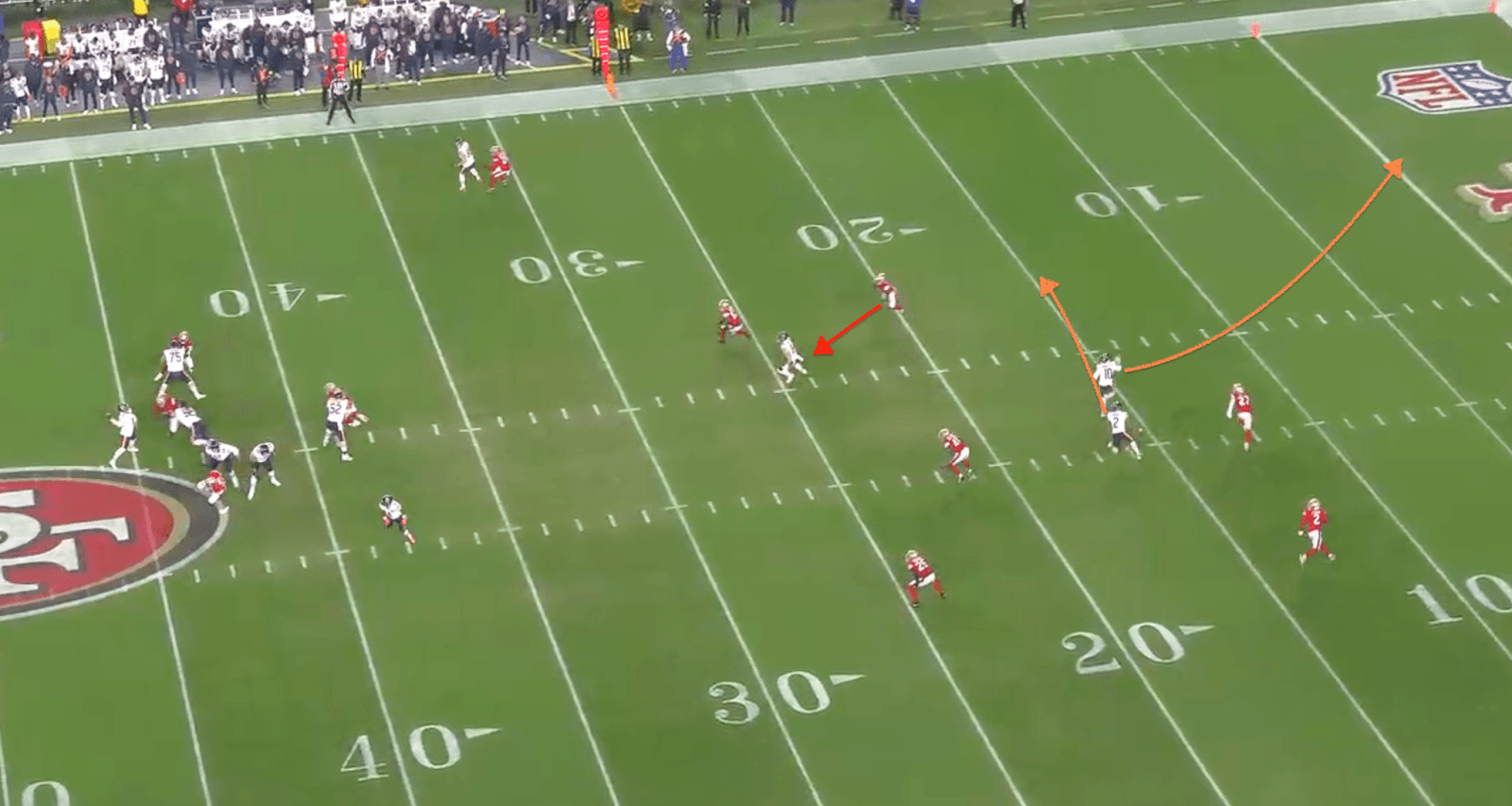 Typically, when Shanahan and Purdy are on their respective games, opponents don’t stand a chance of keeping pace with them. But the Bears took every punch the Niners had and responded with haymakers of their own. Chicago generated nine explosive plays, including touchdowns of 35 yards, 36 yards, and 22 yards. On the first of those scores, Johnson dialed up the perfect coverage beater to pry open San Francisco’s secondary. Colston Loveland’s route drew the weakside safety, which opened up DJ Moore on the dig route.