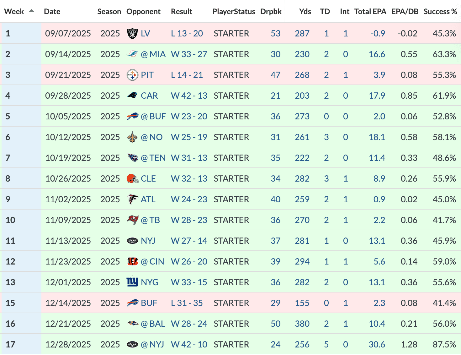 Maye has played six games against defenses ranked in the top half of the league in EPA per dropback. He’s averaged 0.17 EPA and 7.3 yards per dropback against them with a 51.6 percent success rate. Those would be top-five numbers in all three categories for the season, per TruMedia. The Patriots as a whole have averaged 24.8 points per game in those contests and gone 4-2, which includes the Week 15 loss against Buffalo when New England put up 31 points. Sure, Maye has beaten up on bad pass defenses this season, but he’s also had his way with good ones.