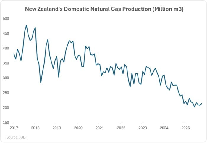 New Zealand’s gas market has been moving from self-sufficient to structurally tight. Domestic output has almost halved in the last 7 years, falling from an average 415 million m³/month in 2017 to 215 million m³/month in 2025, stripping out the buffer that once covered seasonal swings and dry-year hydro shortfalls. The drought-driven winters of 2024–2025 exposed a new reality: as hydro weakened, the country’s power system leaned harder on thermal generation just as gas supply was tightening, triggering sharp spikes in electricity and gas prices and forcing repeated curtailments at large industrial users. The government has moved to revive upstream investment, but new supply will not arrive fast enough to prevent a tighter balance from 2027 onward – making LNG imports a plausible backstop for winter security.
