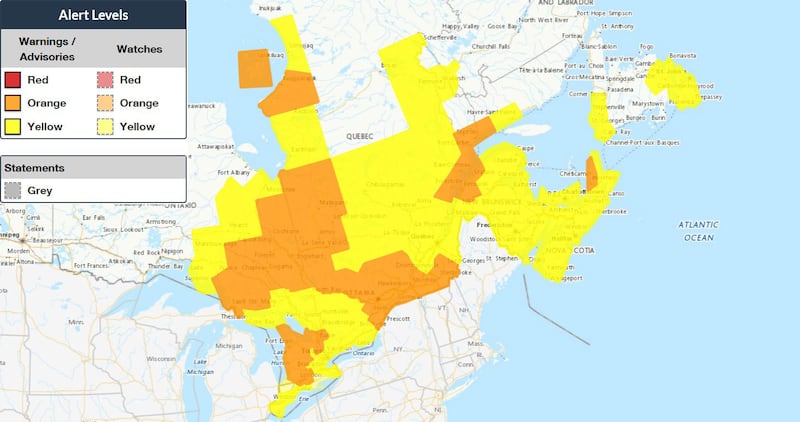 Weather Advisory in Eastern Canada Map highlights where weather advisories and statements have been issued in eastern Canada as of Monday morning. (Environment Canada)
