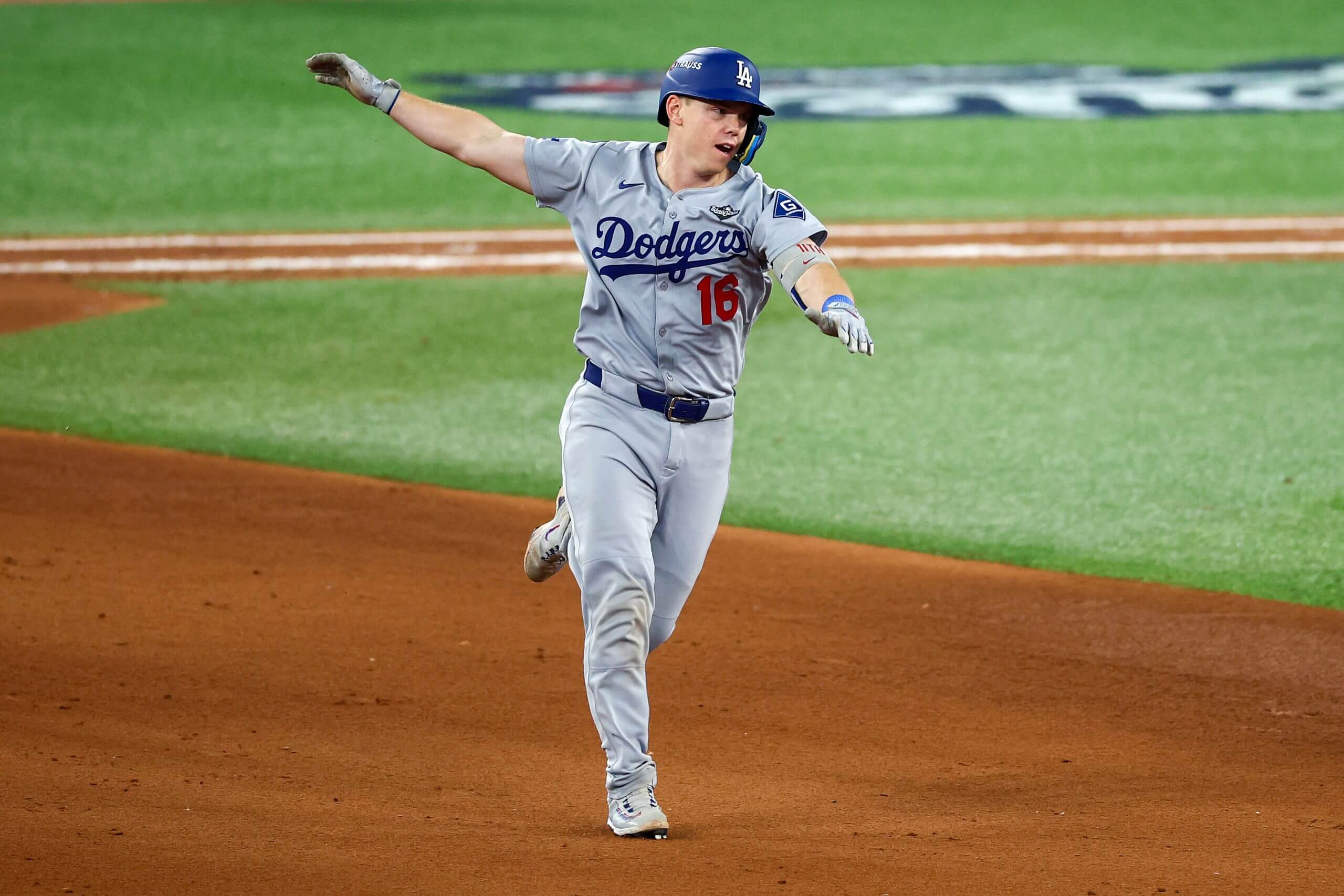 Will Smith waltzes around the bases after his go-ahead homer in the 11th inning of Game 7. (Vaughn Ridley / Getty Images)